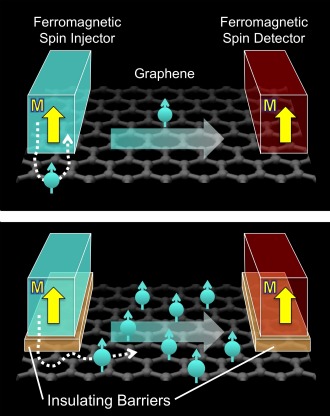 His team has been able to lengthen the spin lifetime through the use of a nanometer-thick insulating layer, known as a "tunnel barrier," in between the ferromagnetic electrode and the graphene layer. They found that the spin injection efficiency increased dramatically, he said.