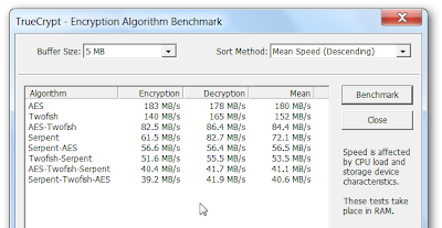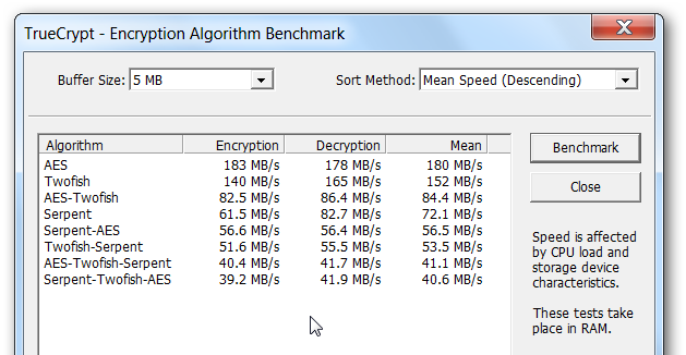 As a good example of the speed difference between different types of encryption, you can use the benchmarking utility built into TrueCrypt’s volume creation wizard—as you can see, AES is by far the fastest type of strong encryption.
