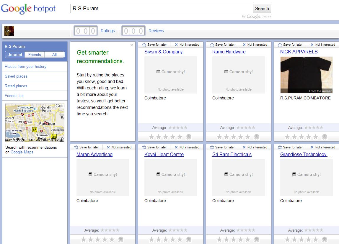 When you search for specific places, such as “R.S.Puram,” in Hotpot, you can filter your search results to see businesses or other places you haven’t rated before; you can also choose to see only places that have been rated by your Hotpot friends.