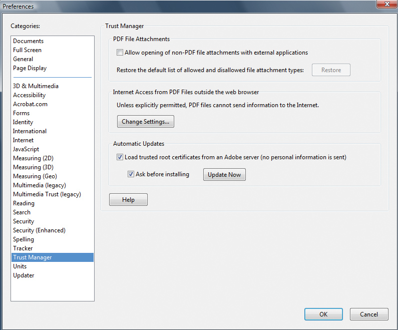You can turn off Adobe Reader's ability to open non-PDF attachments by going to Preferences,clicking Trust Manager, and unchecking Allow opening of non-PDF file attachments with external applications. The next major release of Acrobat and Reader will provide a new "protected mode" against these attacks.