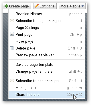 Adding collaborators and members in the wiki is quite simple. Select “Share this site” from the more actions dropdown and enter the email address(s) of collaborators you want to add.