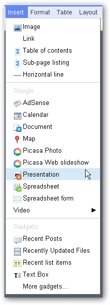 The great thing about Google Sites is that we can put our Google documents (spreadsheet, presentation) or Picasa photo album into any sites that we create in Google Sites.