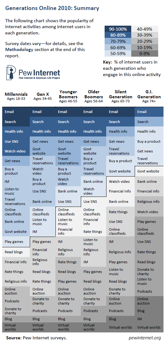 Pew Internet has updated its data on how different generations are using the Internet for 2010, and the results clearly show that the older generations are catching up with younger internet users, even surpassing them in some online activities.